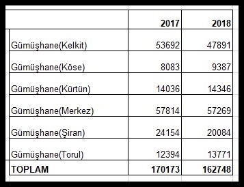 TÜİK verilerine göre 2018 sonu itibariyle Gümüşhane ilinin ve ilçelerin yeni nufusları şöyle oldu.