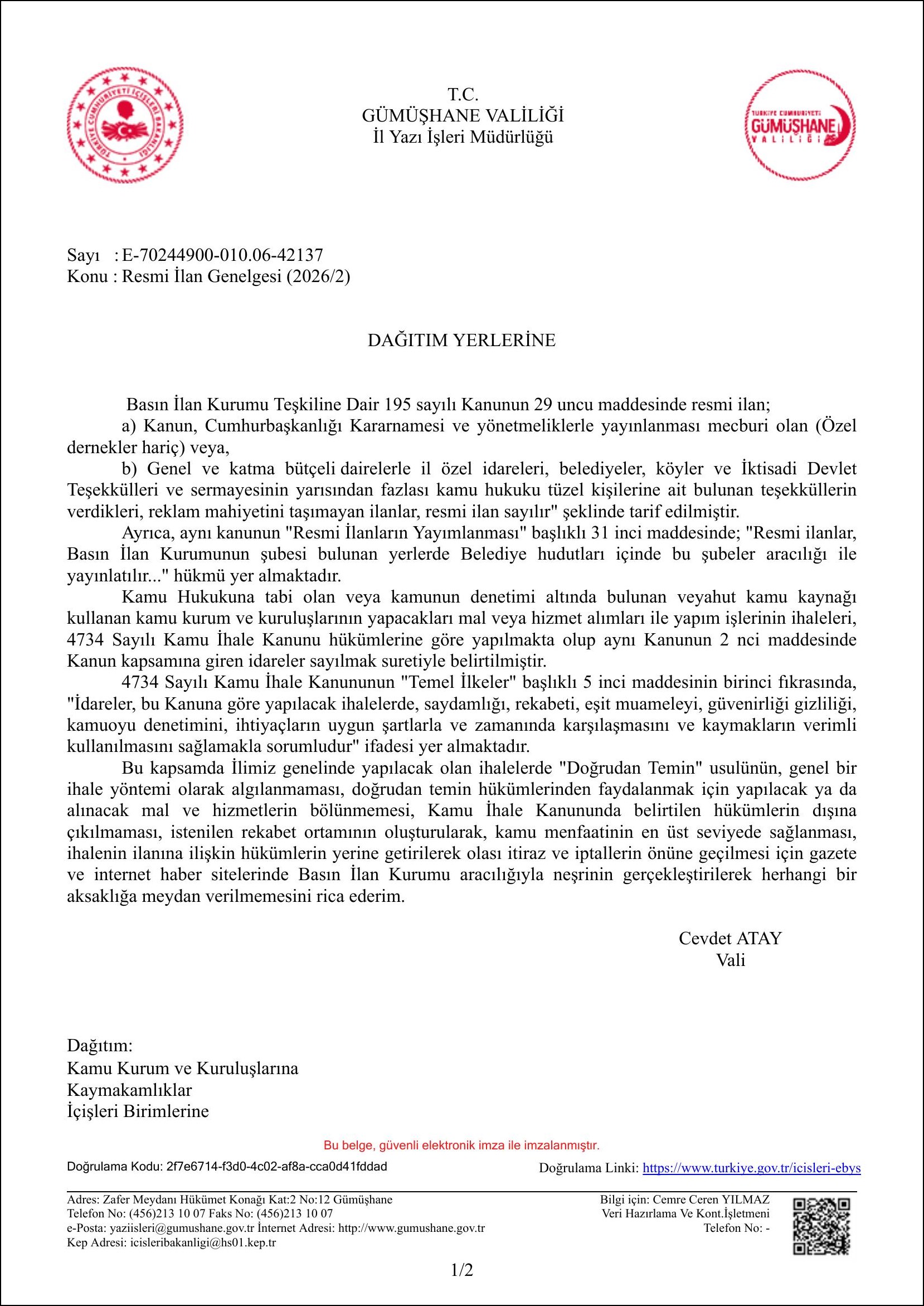 Gümüşhane Valisi Cevdet Atay’ın, resmi ilanlar konusunda uyulması gerekli kurallarla ilgili imzaladığı genelge (2026/2 nolu genelge) Kamu Kurum ve Kuruluşlarına, Kaymakamlıklara ve İçişleri Birimlerine gönderildi.