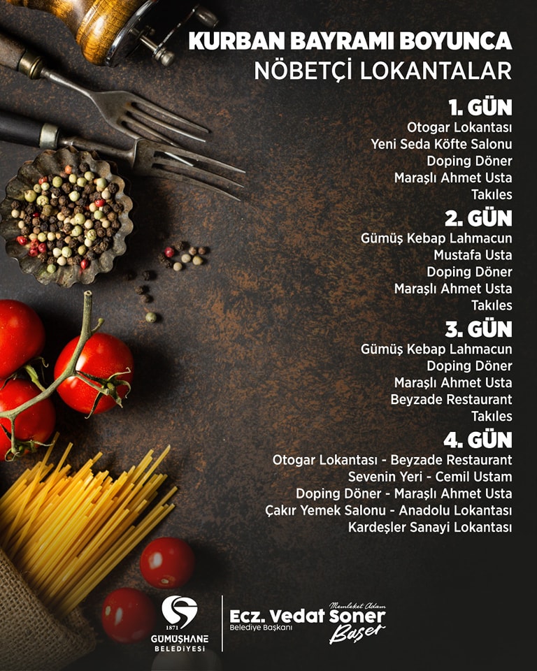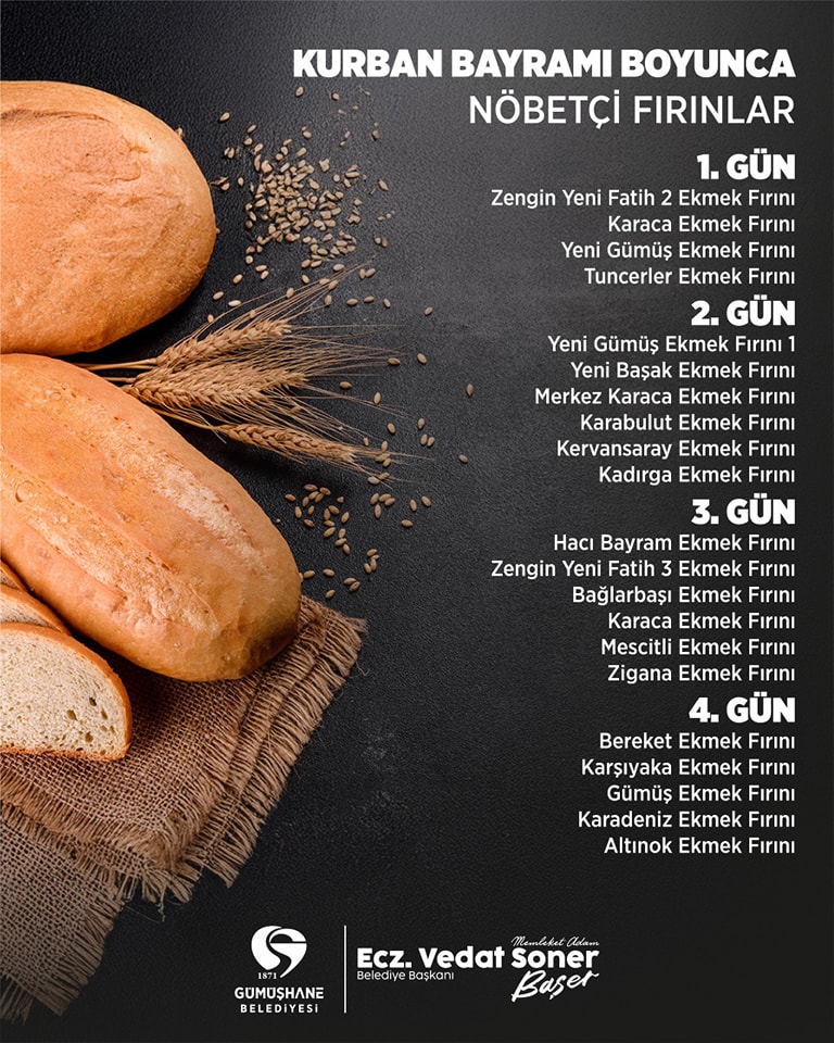 Kurban Bayramı süresince Gümüşhane Merkez ilçede hizmet verecek olan nöbetçi Fırın ve Lokantaların adları Gümüşhane Belediyesi sosyal medya hesabından duyuruldu.