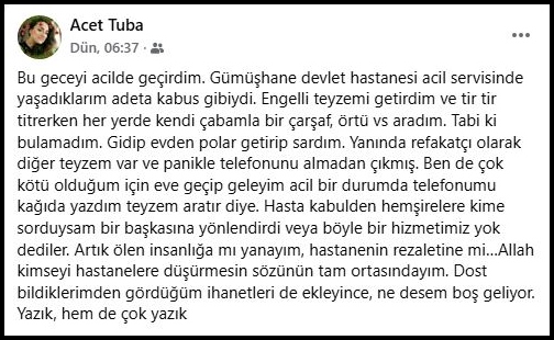 “Bu geceyi acilde geçirdim. Gümüşhane devlet hastanesi acil servisinde yaşadıklarım adeta kabus gibiydi. Engelli teyzemi getirdim ve tir tir titrerken her yerde kendi çabamla bir çarşaf, örtü vs aradım. Tabi ki bulamadım. Gidip evden polar getirip sardım. Yanında refakatçı olarak diğer teyzem var ve panikle telefonunu almadan çıkmış. Ben de çok kötü olduğum için eve geçip geleyim acil bir durumda telefonumu kağıda yazdım teyzem aratır diye. Hasta kabulden hemşirelere kime sorduysam bir başkasına yönlendirdi veya böyle bir hizmetimiz yok dediler. Artık ölen insanlığa mı yanayım, hastanenin rezaletine mi…Allah kimseyi hastanelere düşürmesin sözünün tam ortasındayım. Dost bildiklerimden gördüğüm ihanetleri de ekleyince, ne desem boş geliyor. Yazık, hem de çok yazık”