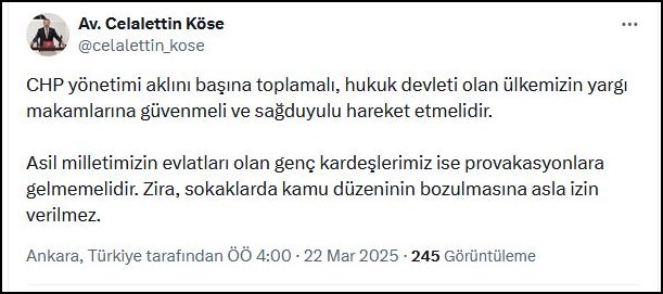 “CHP yönetimi aklını başına toplamalı, hukuk devleti olan ülkemizin yargı makamlarına güvenmeli ve sağduyulu hareket etmelidir. Asil milletimizin evlatları olan genç kardeşlerimiz ise provakasyonlara gelmemelidir. Zira, sokaklarda kamu düzeninin bozulmasına asla izin verilmez.”