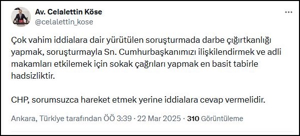 “Çok vahim iddialara dair yürütülen soruşturmada darbe çığırtkanlığı yapmak, soruşturmayla Sn. Cumhurbaşkanımızı ilişkilendirmek ve adli makamları etkilemek için sokak çağrıları yapmak en basit tabirle hadsizliktir. CHP, sorumsuzca hareket etmek yerine iddialara cevap vermelidir.”