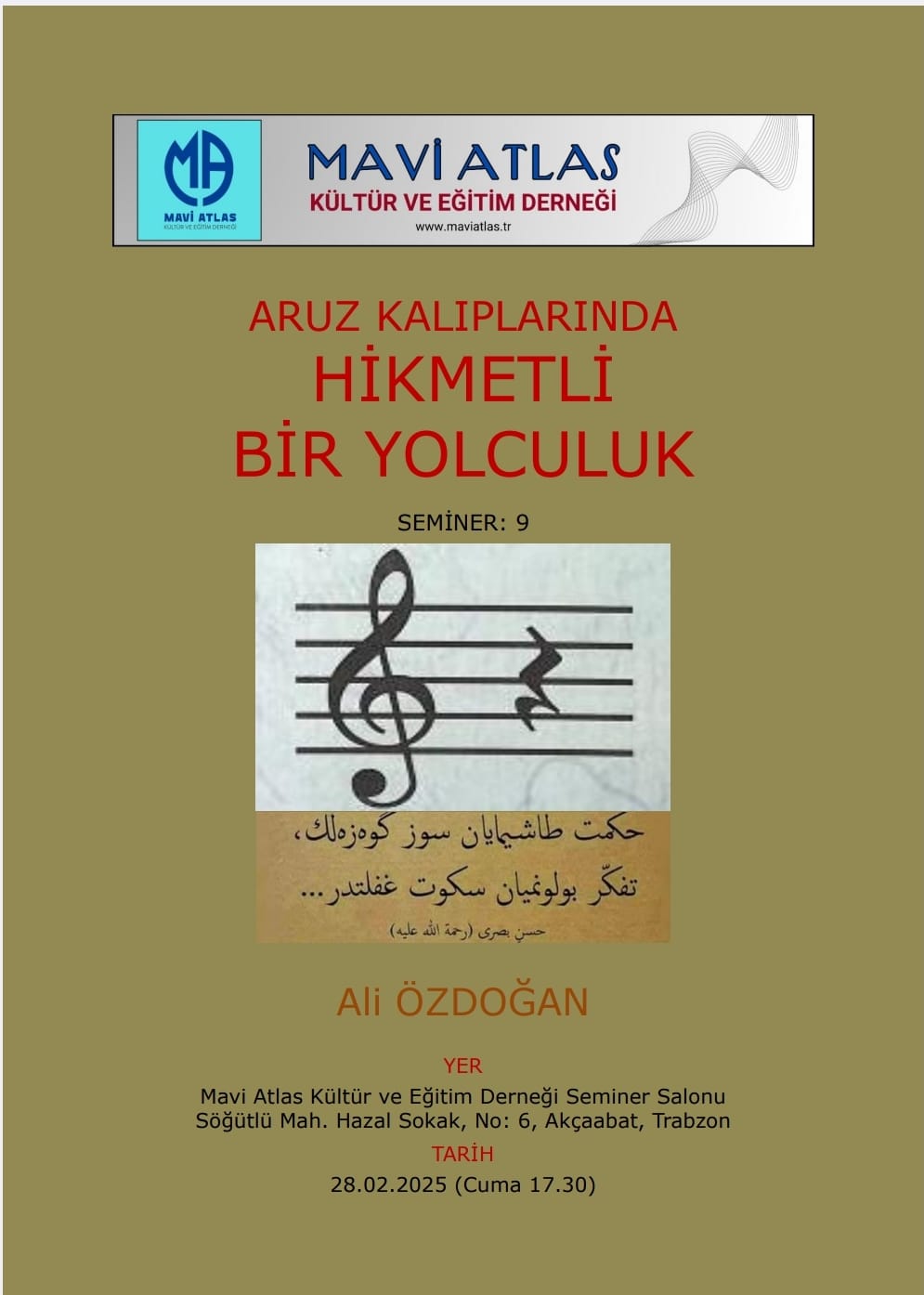 28 Şubat 2025 Cuma günü Akçaaabat’ta Mavi Atlas Derneği Seminer Salonu’nda yapılan etkinlikte Ali Özdoğan “Aruz ve Hikmet” konulu sohbetini yaptı.
