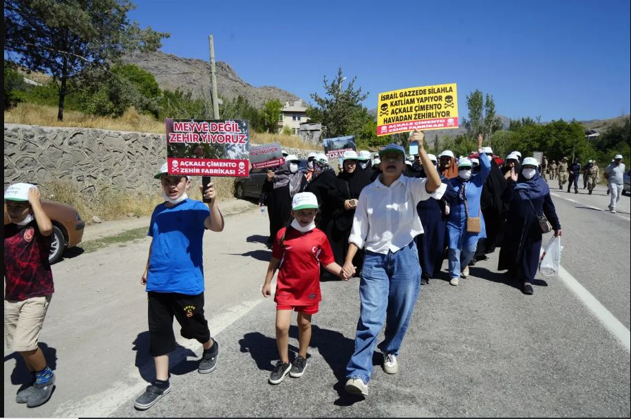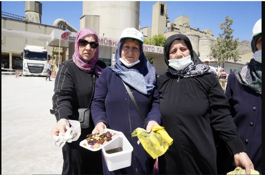 Kadınlar ve çocuklar fabrikanın neden olduğu kirliliği göstermek için kirli toz bezleri ile bahçelerinden topladıkları mahsulleri fabrika önüne atarak tepkilerini dile getirdi.