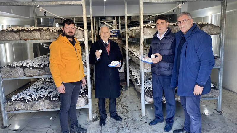 Ziyaret kapsamında tesisi inceleyerek, üretilen mantarları da hasat eden GTSO Yönetim Kurulu Başkanı İsmail Akçay ve Meclis Başkanı Kamuran Gündüz, firma yetkilileri Atif Şahinöz ve oğlu Buğra Şahinöz’ü tebrik etti.