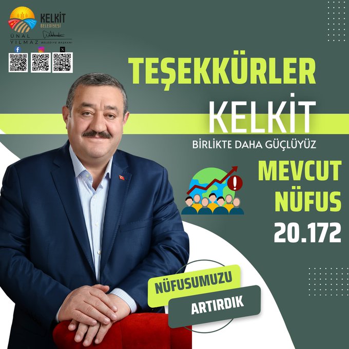 Bu başarıda en büyük pay, hiç şüphesiz, ilçemize gönülden bağlı olan siz değerli hemşehrilerimize aittir. Kelkit’e duyduğunuz sevgi, burada yaşamayı tercih etmeniz, birlik ve beraberlik içinde ilçemizi daha yaşanabilir hale getirme çabanız, hepimiz için büyük bir motivasyon kaynağıdır. Belediye olarak, nüfusumuzun artışıyla birlikte daha güçlü bir Kelkit için çalışmalarımıza aralıksız devam edeceğiz. Alt ve üstyapı projelerimizden sosyal ve kültürel faaliyetlere, istihdam olanaklarından eğitim ve sağlık hizmetlerine kadar her alanda ilçemizin kalkınmasını sağlamak adına var gücümüzle çalışmaya devam edeceğiz. Hedefimiz, hemşehrilerimizin yaşam standartlarını yükseltmek, Kelkit’i her geçen gün daha modern, daha yaşanabilir ve herkes için fırsatlar sunan bir şehir haline getirmektir.