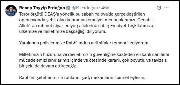 “Terör örgütü DEAŞ’a yönelik bu sabah Yalova’da gerçekleştirilen operasyonda şehit olan kahraman emniyet mensuplarımıza Cenab-ı Allah’tan rahmet niyaz ediyor; ailelerine sabır; Emniyet Teşkilatımıza, ülkemize ve milletimize başsağlığı diliyorum. Yaralanan polislerimize Rabb’imden acil şifalar temenni ediyorum. Milletimizin huzuruna ve devletimizin güvenliğine kasteden eli kanlı canilerle mücadelemizi sınırlarımız içinde ve ötesinde kararlı, çok boyutlu ve tavizsiz bir şekilde devam ettireceğiz. Rabb’im şehitlerimizin ruhlarını şad, mekânlarını cennet eylesin.”