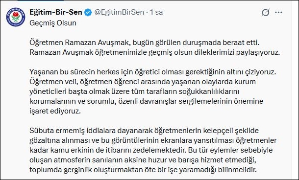 Öğretmen Ramazan Avuşmak, bugün görülen duruşmada beraat etti. Ramazan Avuşmak öğretmenimizle geçmiş olsun dileklerimizi paylaşıyoruz.