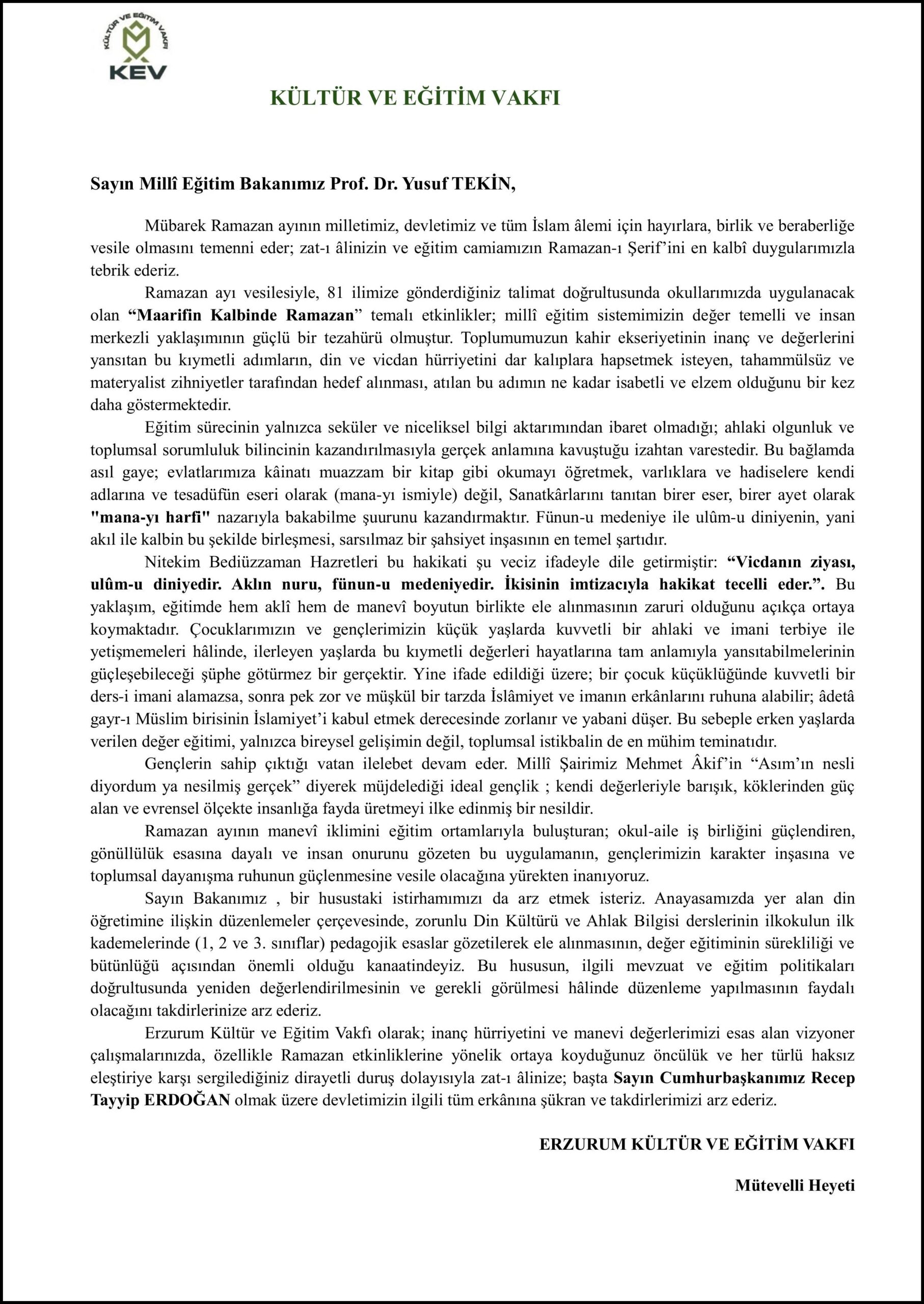 Türkiye’nin önde gelen Risale-i Nur STK’larından Erzurum Kültür ve Eğitim Vakfı Mütevelli Heyeti, Ramazan etkinlikleri genelgesi ve okullarda yapılan etkinliklerden dolayı Milli Eğitim Bakanı Yusuf Tekin’e hitaben yazdığı hem teşekkür hem de tavsiyeler içeren mektubunu kamuoyu ile paylaştı. Açık mektup şöyledir: