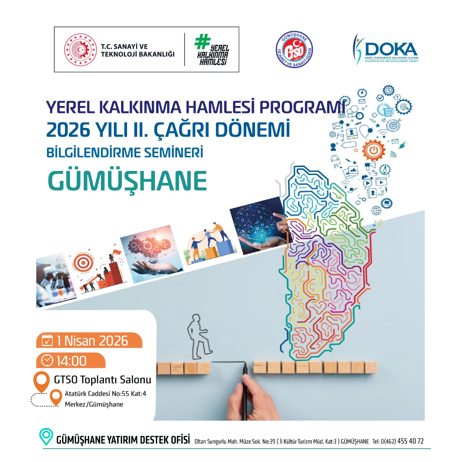 Gümüşhane Ticaret ve Sanayi Odası ev sahipliğinde 1 Nisan 2026 Çarşamba günü Saat:14:00’de GTSO Toplantı Salonunda gerçekleştirilecek seminerde ilk olarak 2026 Yılı Yerel Kalkınma Hamlesi Programı kapsamında Doğu Karadeniz Kalkınma Ajansı Uzmanları tarafından Gümüşhane ili için belirlenen sektörler ve destek miktarları ile başvuru süreci hakkında bilgilendirme gerçekleştirecek.