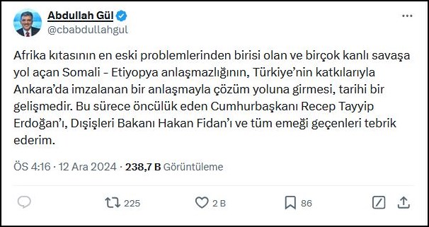 “Afrika kıtasının en eski problemlerinden birisi olan ve birçok kanlı savaşa yol açan Somali – Etiyopya anlaşmazlığının, Türkiye’nin katkılarıyla Ankara’da imzalanan bir anlaşmayla çözüm yoluna girmesi, tarihi bir gelişmedir. Bu sürece öncülük eden Cumhurbaşkanı Recep Tayyip Erdoğan’ı, Dışişleri Bakanı Hakan Fidan’ı ve tüm emeği geçenleri tebrik ederim.”