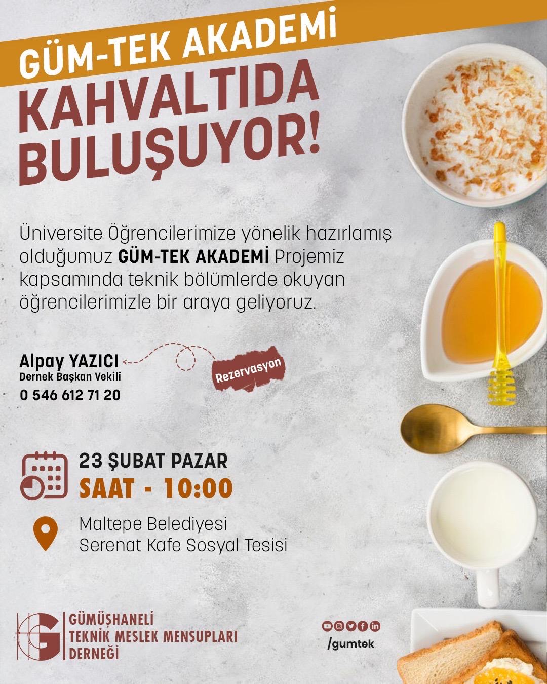 Tabi burada öğrencilerimizin kendi fikirlerinin de karşılık bulacağı bir metot ortaya koymak istiyoruz. Bu vesileyle 23 Şubat Pazar günü İstanbul’da Maltepe Belediyesi Serenat Kafe Sosyal Tesislerinde düzenleyeceğimiz kahvaltı programını önemsiyoruz. Çünkü katılımcı ve sürdürülebilir bir anlayışla yürüttüğümüz dernek çalışmalarımızda öğrenci kardeşlerimizin de katılımları ayrıca önemlidir. Böylelikle teknik bölümlerde okuyan bütün öğrencilerimizi kahvaltı programımıza bekliyoruz.”