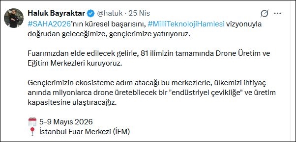 #SAHA2026’nın küresel başarısını, #MilliTeknolojiHamlesi vizyonuyla doğrudan geleceğimize, gençlerimize yatırıyoruz. ​Fuarımızdan elde edilecek gelirle, 81 ilimizin tamamında Drone Üretim ve Eğitim Merkezleri kuruyoruz. Gençlerimizin ekosisteme adım atacağı bu merkezlerle, ülkemizi ihtiyaç anında milyonlarca drone üretebilecek bir “endüstriyel çevikliğe” ve üretim kapasitesine ulaştıracağız.”