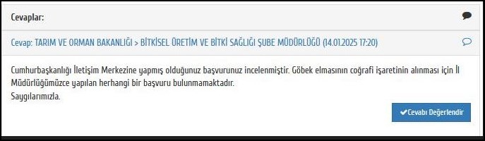 “Cumhurbaşkanlığı İletişim Merkezine yapmış olduğunuz başvurunuz incelenmiştir. Göbek elmasının coğrafi işaretinin alınması için İl Müdürlüğümüzce yapılan herhangi bir başvuru bulunmamaktadır.