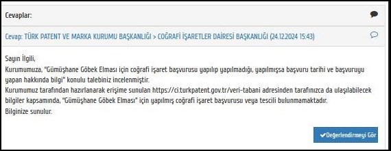Gümüşhane Göbek Elması’nın coğrafi işaret alıp almadığını veya bu konuda bir müracaat olup olmadığını Türk Patent ve Marka Kurumu Başkanlığı’na’na Cimer vasıtası ile 18.12.2024 tarihinde sorduk. Aldığımız cevap şöyledir: