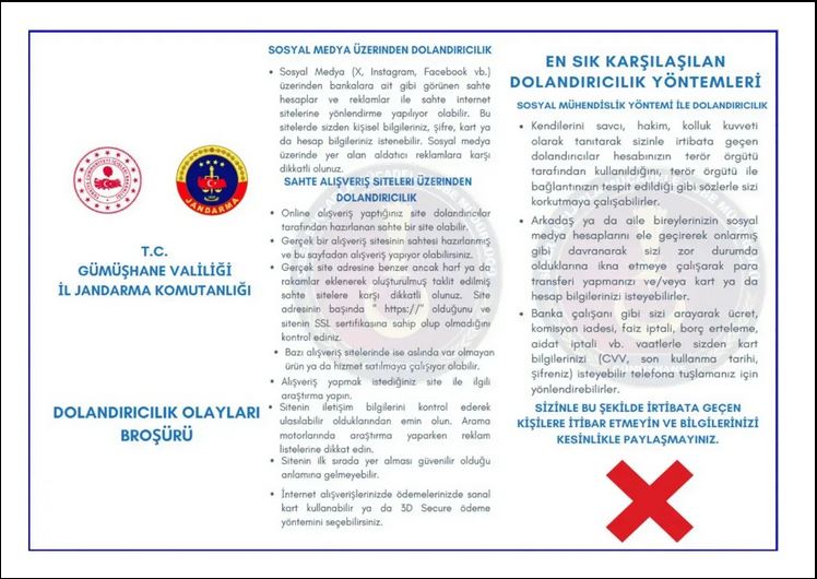 Vatandaşlarımızın siber zorbalar ve suçlular tarafından dolandırılmaması için Gümüşhane İl Jandarma Komutanlığı Siber Suçlarla Mücadele Şube Müdürlüğü tarafından hazırlanan bilgilendirme broşürleri dağıtılıyor. Bu bağlamda; son iki ay içerisinde 2772 vatandaşımıza 485 adet broşür dağıtılarak eğitimler verildi.