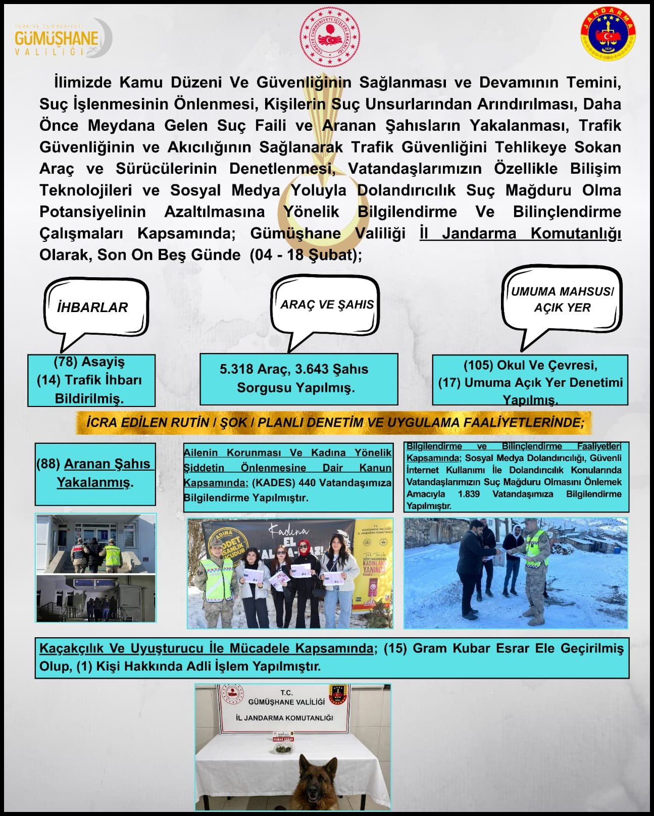Gümüşhane Valiliği İl Jandarma Komutanlığı tarafından son 15 günde (04–18 Şubat) gerçekleştirilen denetim ve uygulama faaliyetlerinin bilançosu açıklandı.