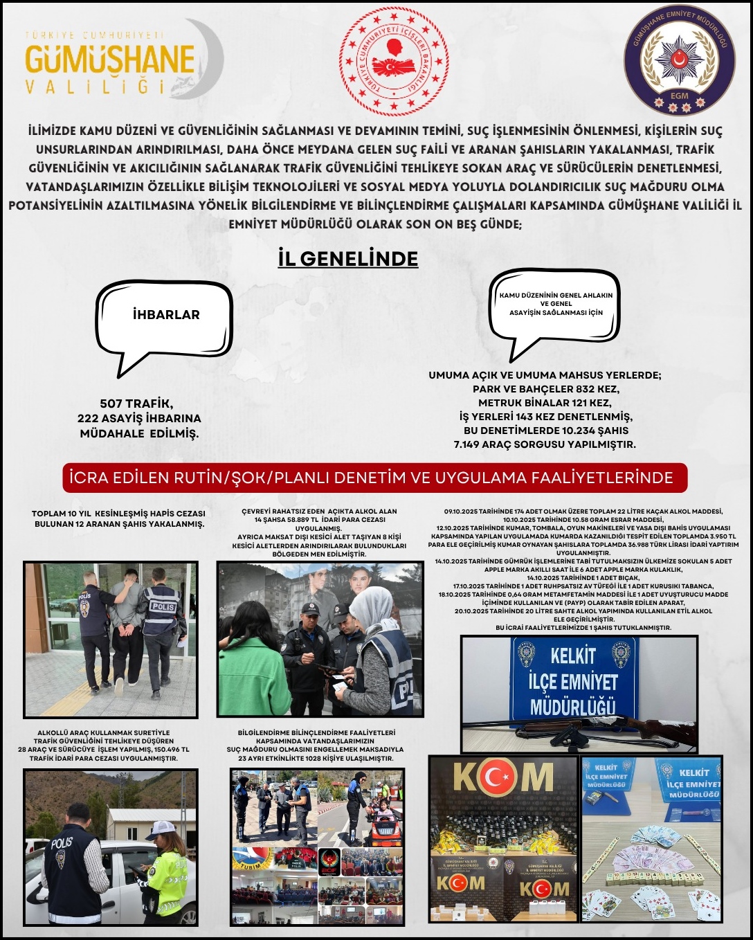 Gümüşhane Valiliği sosyal medya hesabında 22 Ekim 2025 tarihinde yayımlanan paylaşıma göre son 15 günlük dönemde Gümüşhane Polisi’nin yaptığı bazı çalışmalar şöyledir: