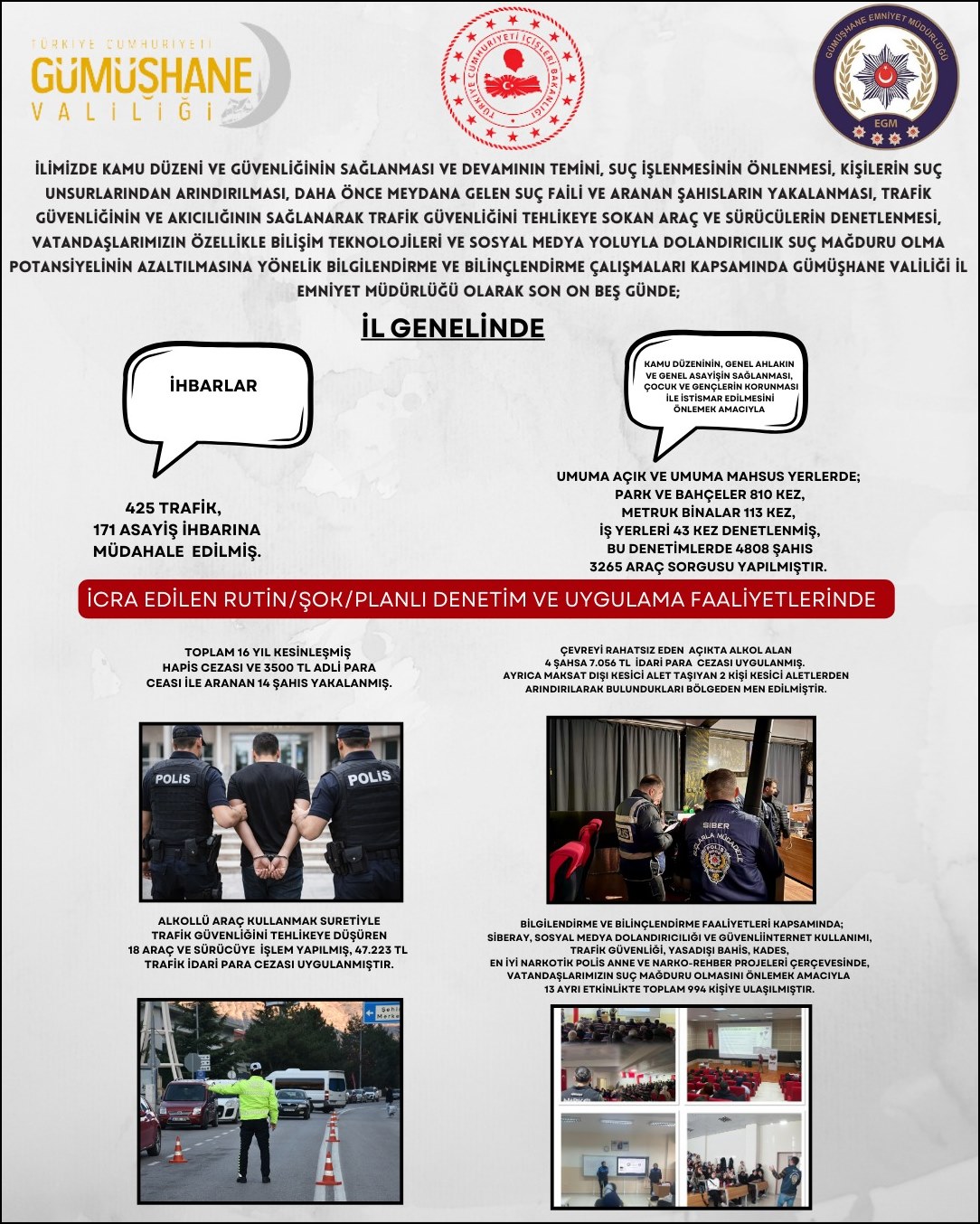 Gümüşhane Valiliği’nden yapılan bilgilendirmeye göre son 15 gün içerisinde yürütülen çalışmalar kapsamında 425 trafik ve 171 asayiş ihbarına müdahale edildi.