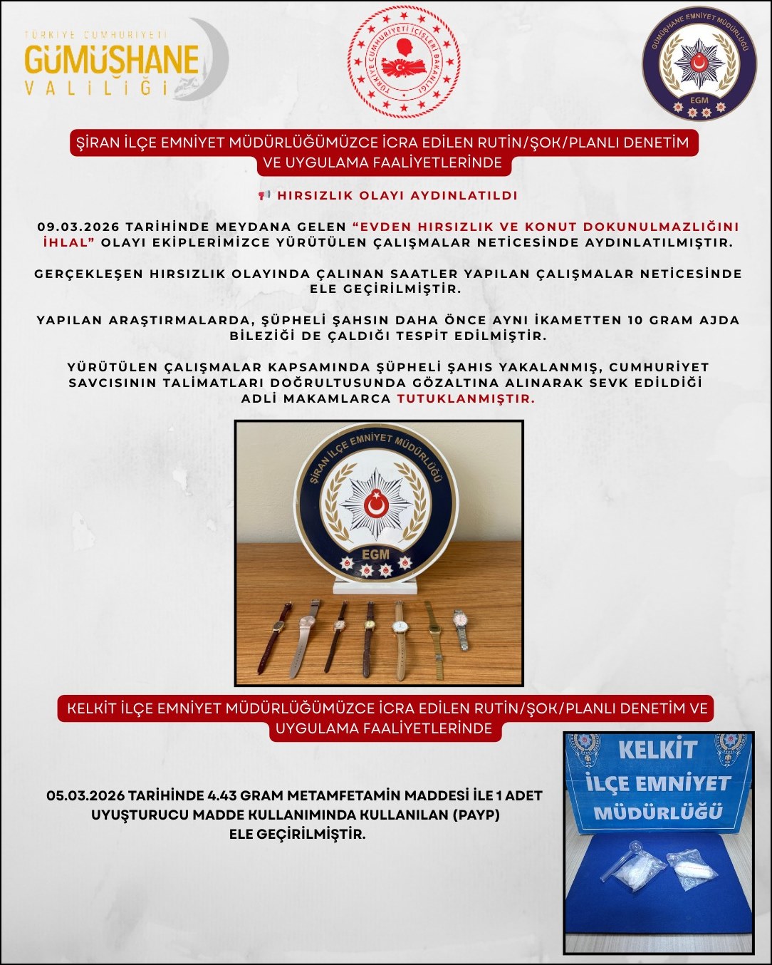 Öte yandan Şiran İlçe Emniyet Müdürlüğü ekipleri, 9 Mart 2026 tarihinde meydana gelen “evden hırsızlık ve konut dokunulmazlığını ihlal” olayını kısa sürede aydınlattı.