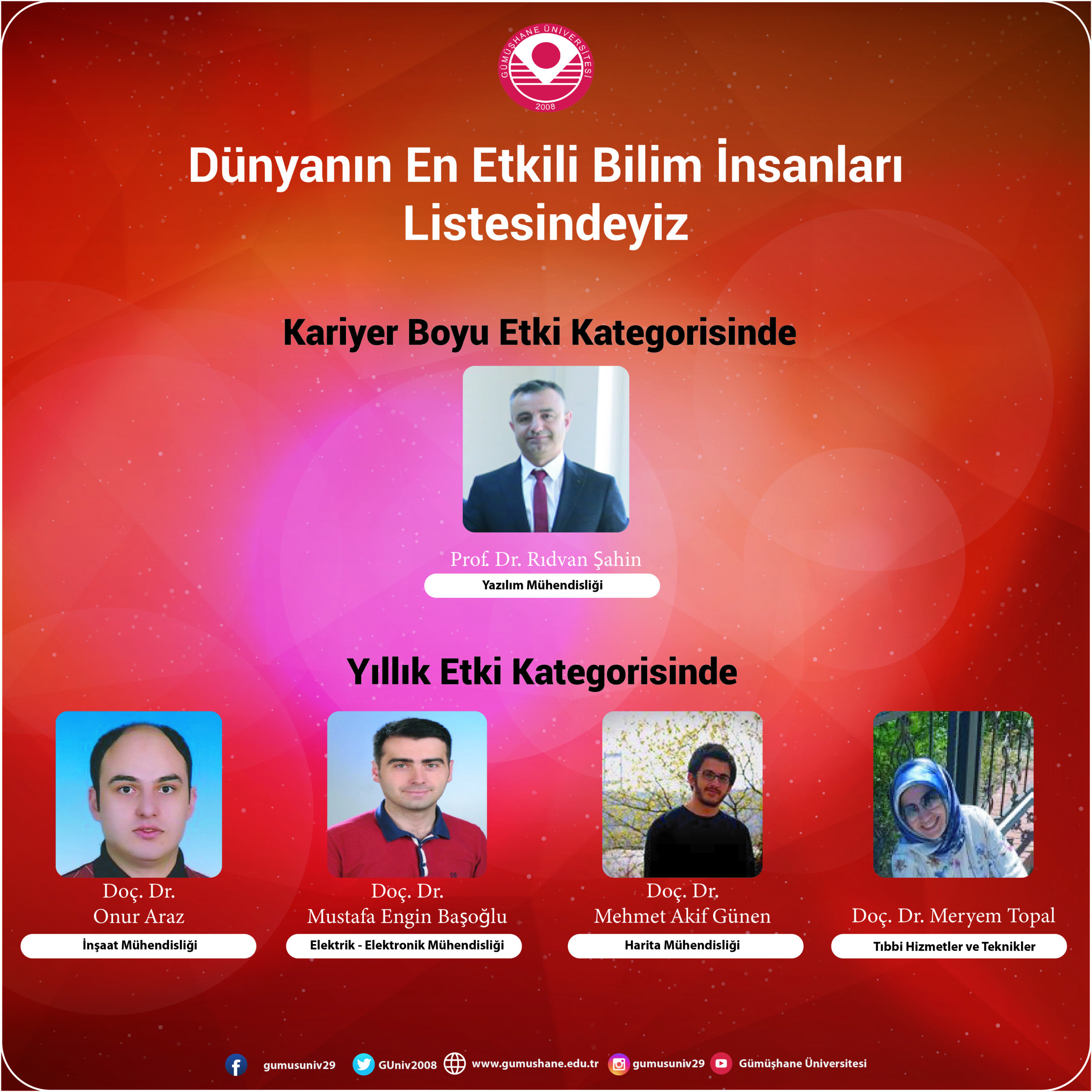Yıllık Etki kategorisinde ise: İnşaat Mühendisliği Bölümü Öğretim Üyesi Doç. Dr. Onur Araz, Elektrik – Elektronik Mühendisliği Bölümü Öğretim Üyesi Doç. Dr. Mustafa Engin Başoğlu, Harita Mühendisliği Bölümü Öğretim Üyesi Doç. Dr. Mehmet Akif Günen ve Gümüşhane Sağlık Hizmetleri Meslek Yüksekokulu Tıbbi Hizmetler ve Teknikler Bölümü Öğretim Üyesi Doç. Dr. Meryem Topal yer aldı.