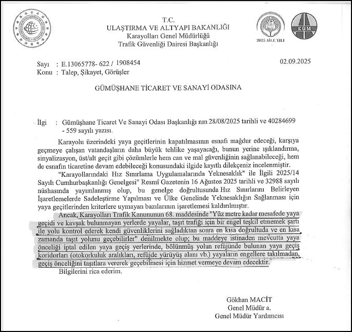 Karayolları Genel Müdürlüğümüze bu yol güzergahındaki yaya geçitlerinin kapatılması sonucunda yayaların ve bölgede faaliyet gösteren ticari işletmelerin yaşadığı mağduriyeti anlatan ve gerekli düzenlemenin bir an önce yapılması gerektiğini belirten yazışmaları yaptık. Karayolları Genel Müdürlüğünden bizlere verilen cevabı yazıda ‘’Mevcut yaya önceliği iptal edilen yaya geçiş yerlerinde, bölünmüş yolun refüjünde bulunan yaya geçiş koridorları (otokorkuluk aralıkları, refüjde yürüyüş alanı) yayaların engellere takılmadan, geçiş önceliğini taşıtlara vererek geçebilmesi için hizmet veremeye devam edecektir’ denilmektedir.