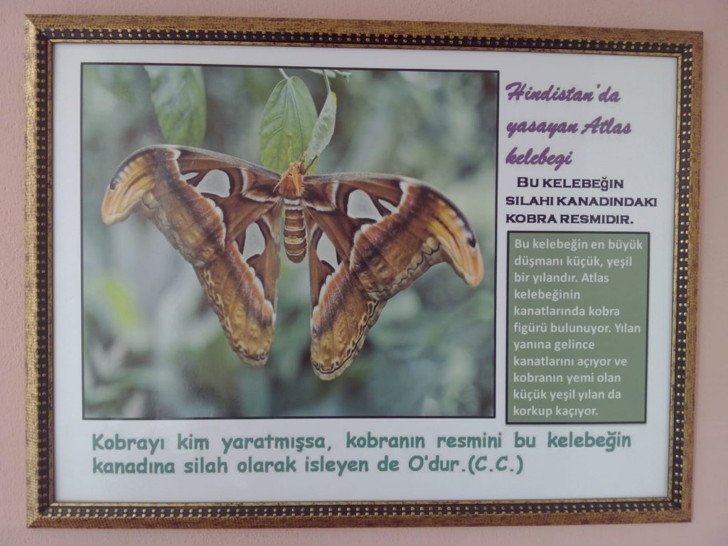 Hindistan ormanlarında yaşayan atlas kelebeğini kim yaratmışsa, bu kelebeğin kanatlarına kobra yılanı figürünü işleyen de o zattır. Veya diğer bir ifadeyle, kobra yılanını kim yaratmışsa, kobranın resmini atlas kelebeğinin kanatlarına işleyen de odur. Yoksa bu işi nasıl izah edebilirsiniz? Tabiat mı yaptı diyeceksiniz? Akılsız, şuursuz bir tabiatın atlas kelebeğinin düşmanını hesap edip, kobra resmini kelebeğin kanatlarına çizmiş olması düşünülebilir mi? Peki o halde bu resmi kim yaptı? Hangi ressam yaptı? Kobra yılanını alıp, hem de her türlü rengiyle, şekliyle nazik ve zenne bir kelebeğin kanatlarına resmetmek Allah’tan başka kimin işi olabilir ki?