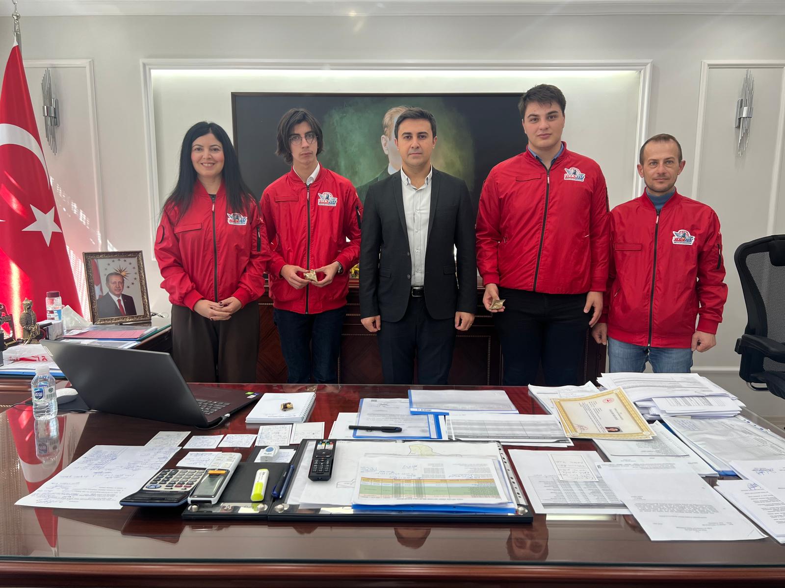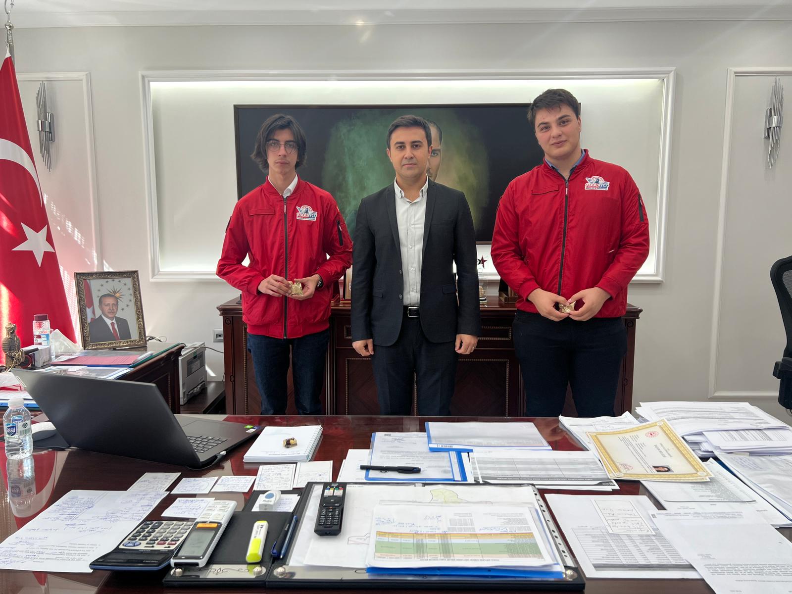 Kaymakam Çelik; öğrenciler Artan Toprak Ergin ve Tarık Aslan ile danışman öğretmenler Tuğba Tat ve Mevlüt Serdar Aksoy’u ve okul müdürü Hasan Efe’yi tebrik ederek ödüllendirdi.
