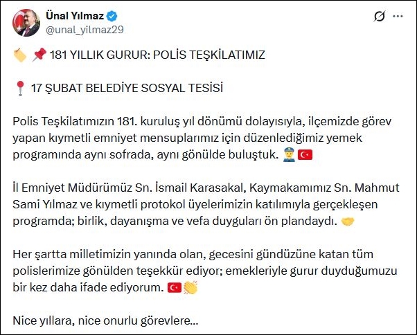 “Polis Teşkilatımızın 181. kuruluş yıl dönümü dolayısıyla, ilçemizde görev yapan kıymetli emniyet mensuplarımız için düzenlediğimiz yemek programında aynı sofrada, aynı gönülde buluştuk.