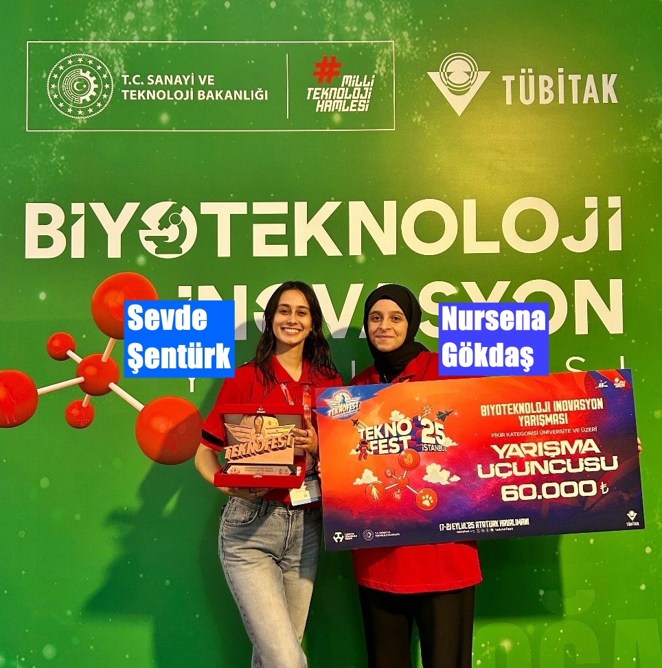17-21 Eylül 2025 tarihlerinde İstanbul’da gerçekleştirilen ve 64 farklı yarışmaya 81 ilimizin yanı sıra 96 ülkeden 565 bin takım ve 1 milyon 200 bin yarışmacının katıldığı TEKNOFEST 2025 etkinliklerinde “Biyoteknoloji ve İnovasyon Yarışması Fikir Kategorisi”nde Türkiye 3.sü olan ekibin projesi bilim dünyasını heyecanlandırdı.
