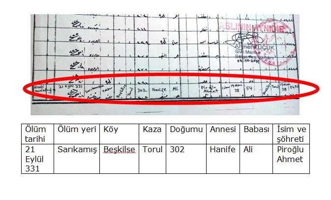 Nüfus ve Vatandaşlık İşleri Genel Müdürlüğü arşivlerindeki “ÖLÜM VUKUAT” Belgelerinde Piroğlu Ahmet’in ölüm kaydı şu şekilde işlenmiştir.”