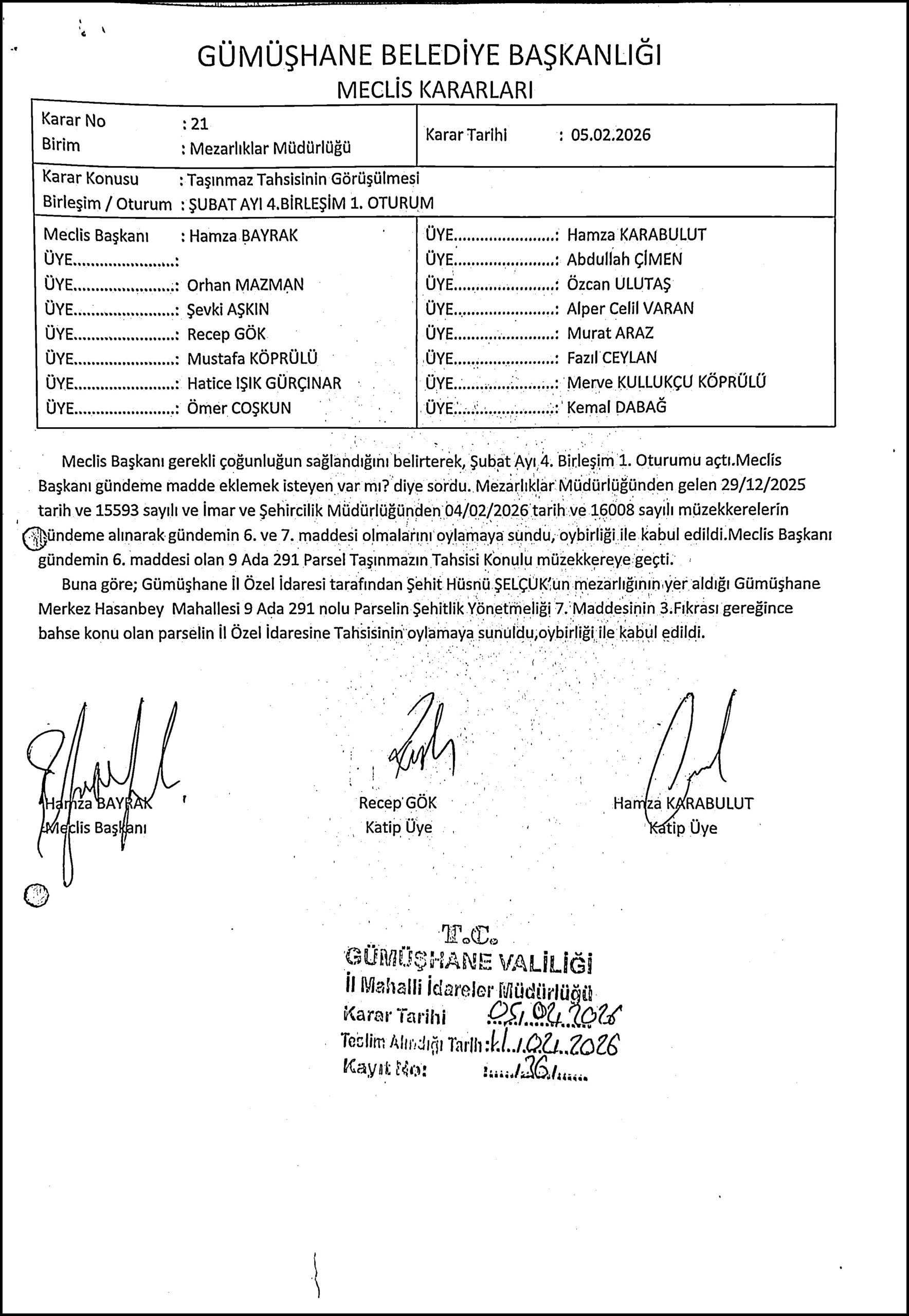 Gümüşhane Belediye Meclisi 05.02.2026 tarihli toplantısında ilgili alanı oy birliği ile Şehitlik olarak İl Özel İdaresi’ne tahsis etti. Tahsis işleminden sonra tapu devir işlemleri de yapılmış olacak.