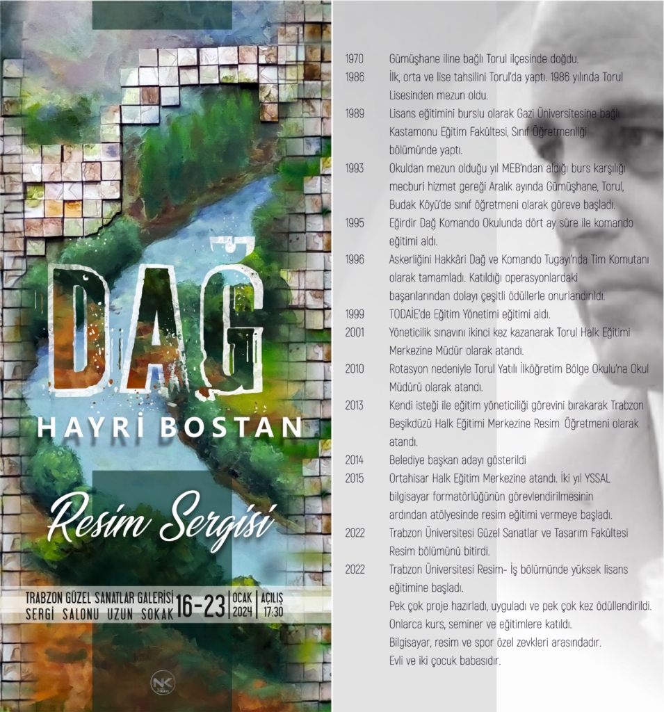 Torullu hemşerimiz Hayri Bostan, 16 Ocak 2024 salı günü Trabzon Uzun Sokak’ta bulunan Trabzon Güzel Sanatlar Galerisi Sergi Salonu’nda kişisel resim sergisi açacak.