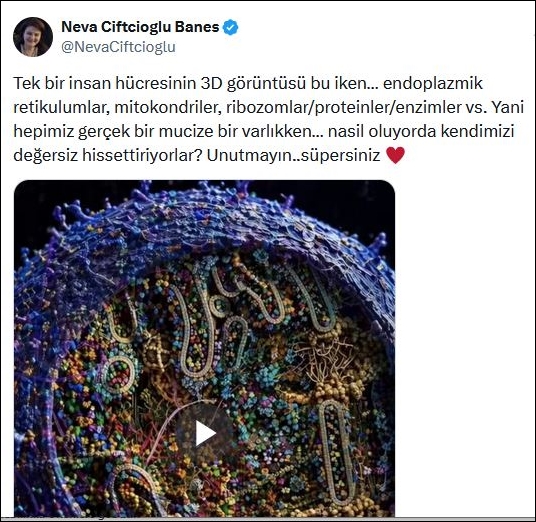 “Tek bir insan hücresinin 3D görüntüsü bu iken… endoplazmik retikulumlar, mitokondriler, ribozomlar/proteinler/enzimler vs. Yani hepimiz gerçek bir mucize bir varlıkken… nasil oluyorda kendimizi değersiz hissettiriyorlar? Unutmayın..süpersiniz”