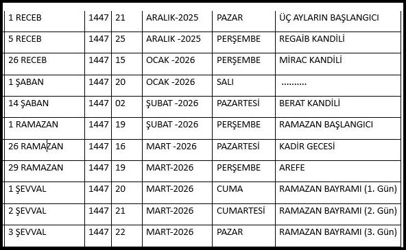 Dini hayatımızda önemli yeri olan ve Recep, Şaban ve Ramazan Aylarını içine alan “Üç Aylar” yarın (21 Aralık 2025 Pazar günü başlıyor)